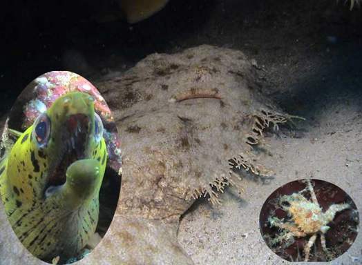 Fransen-Wobbegong der sogenannte Teppich Hai gibt es reichlich. Muränen (Gelbkopfmuräne = Gymnothorax fimbriatus) und Spinnenkrebse findet man in kleinen Höhlen und Löchern.
