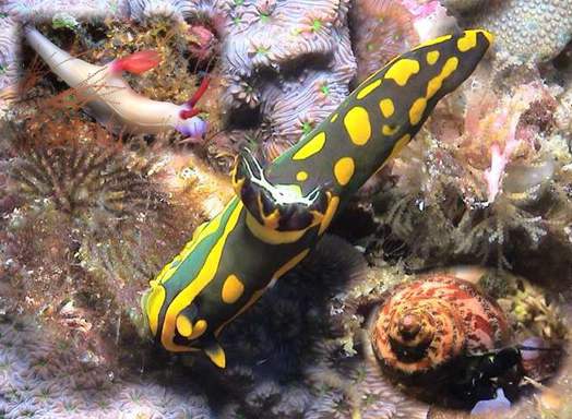Schnecken in vielen Variationen, Prachtsternschnecke (Hypselodoris bullockii ?), mitte (Tambja olivaria) unten rechts Katzenaugen-Turbanschnecke (Turbo petholatus)