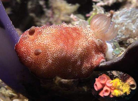 oben Prachtsternschnecke (Chromodoris reticulata) und unten rechts die Brutfürsorge bei der Wendeltreppenschnecke (Epitonium billeeanum)