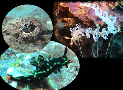 Typisch für dieses Gewässer viele verschiedene bunte Nacktschnecken, wie hier abgebildet Neonsternschnecke (Nembrotha kubaryana) Fadenschnecke (Flabellin sp.). Das Auge gehört zu einem Krokodilsfisch (Platycephalidae...).