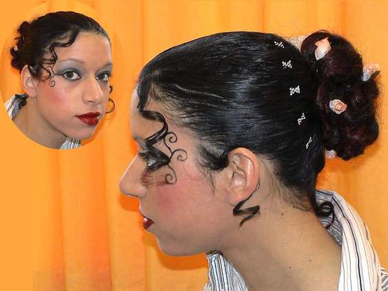 Nina mit einer Hochsteckfrisur verziert mit kleinen Rosen und locker ins Gesicht fallenden Strähnen.